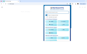 Med Search Pro เป็นส่วนขยาย Chrome ที่มีนวัตกรรมออกแบบมาเพื่อเพิ่มประสิทธิภาพในการค้นคว้าทางการแพทย์สำหรับมืออาชีพและนักเรียนเช่นกัน เครื่องมือนี้ช่วยให้ผู้ใช้สามารถทำการค้นหาแบบพร้อมกันในฐานข้อมูลทางการแพทย์ที่มีชื่อเสียงถึง 17 แห่ง รวมถึง PubMed, Cochrane และ WHO ช่วยประหยัดเวลาอันมีค่าโดยการรวมผลลัพธ์ไว้ในอินเทอร์เฟซเดียว ส่วนขยายนี้มีฟีเจอร์การรวมคลิปบอร์ดอัจฉริยะ ทำให้สามารถคัดลอกคำค้นหาได้อย่างราบรื่นสำหรับฐานข้อมูลที่ไม่รองรับพารามิเตอร์ URL ซึ่งช่วยปรับปรุงประสบการณ์ของผู้ใช้